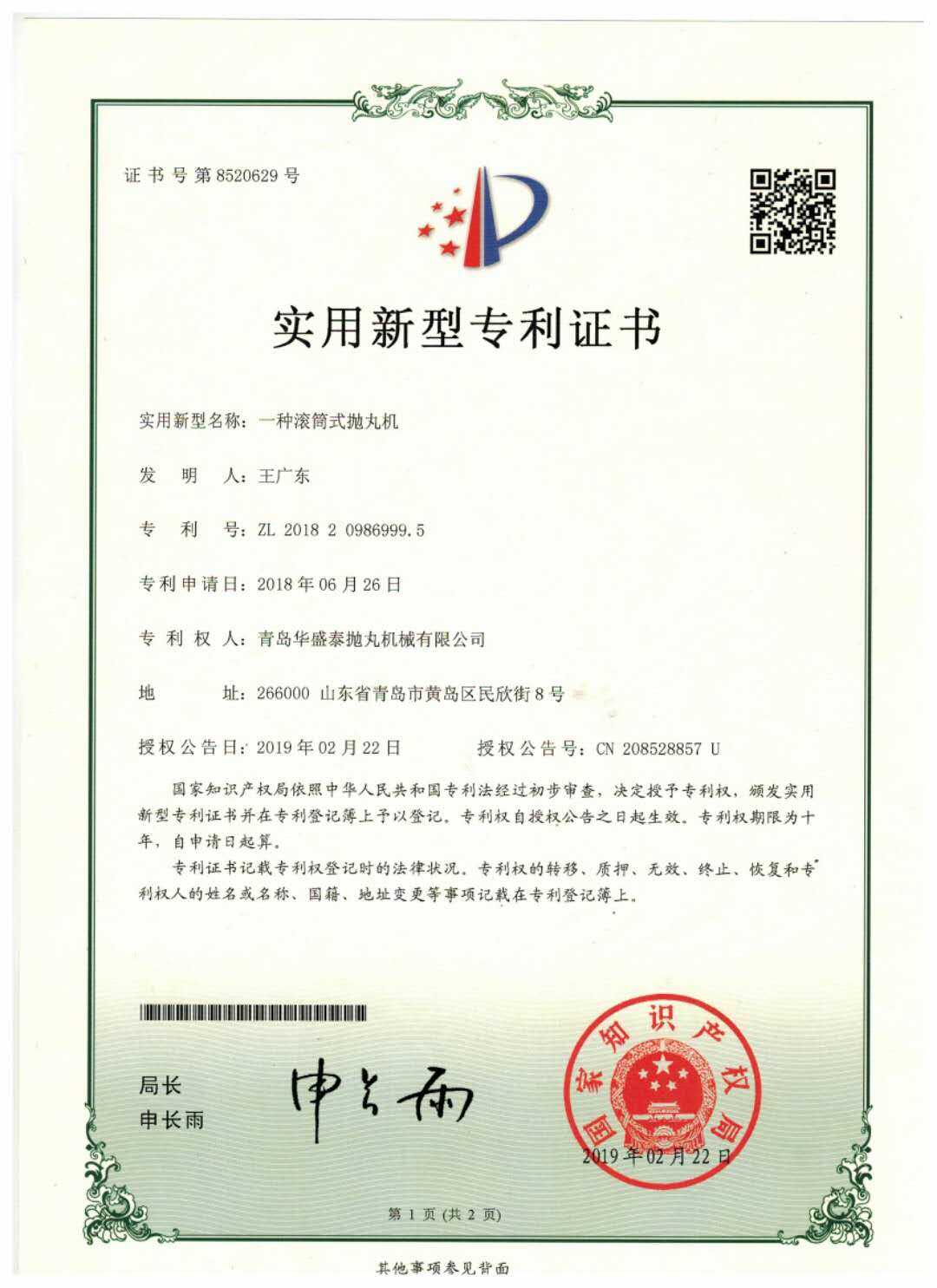 • 實用新型專利證書